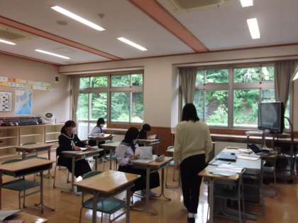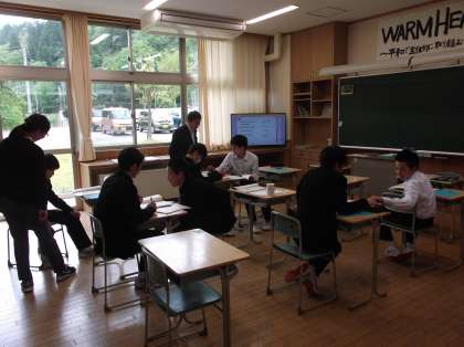 2年生の英語です。話す相手の目を見て、身振りや表情を交えて伝えようと頑張っていました。