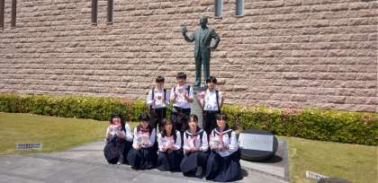 カップヌードル・ミュージアムの見学を終え、カップヌードルの開発者である安藤百福の像の前で記念撮影しました。