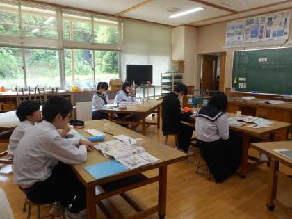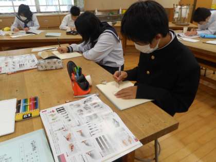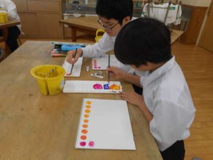 本日の学習課題は、「見る角度を変えて、形をとらえよう・混色してたくさんの色を作ろう」です。授業前半は、紙コップのスケッチです。時間制限の中で仕上げた作品をペアで良い点を話し合います。後半は、2色を混ぜ、色のグラデーションを作ります。