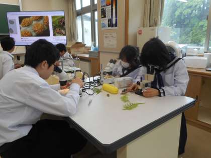 本日の学習課題は、「種子を作らない植物には、どんな特徴があるか」です。種子で増えないシダ植物、コケ植物について学習します。シダ植物である「イヌワラビ」のつくりを1人1台の顕微鏡で観察し、「胞子」「胞子のう」のつき方を確認します。