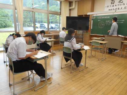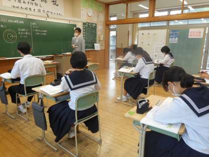 本日の学習は、「図形の性質の証明」です。ドーナツ形の土地の面積をS、その道幅をa、道の真ん中を通る幅の長さをlとした場合、S=alとなること証明します。証明問題は、解くのに時間がかかりますが、どの生徒も集中して取り組んでいました。