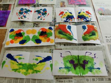デカルコマニー技法に挑戦しました。絵の具を塗った紙を半分に折り、圧力をかけ、押しつぶされた絵の具が作る偶発的な模様を楽しみました。
