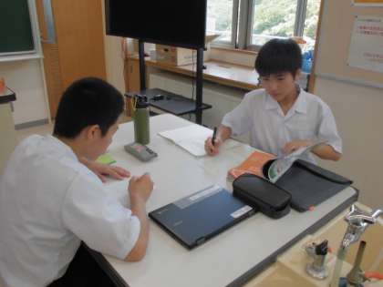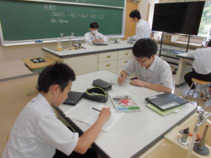2年生は、理科の授業で質量保存の法則について復習しました。ワークシートを友達と一緒に考えたり教科書で調べたりして、学習しました。