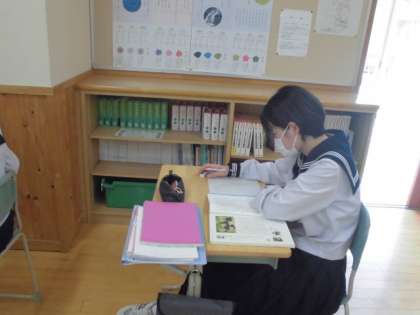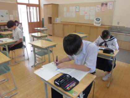 3年生は、教科書にある説明文を読みながら段落ごとの要約に取り組みました。文章の内容をしっかりと整理しようと、生徒たちは文章を何度も読んでいました。