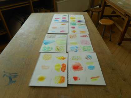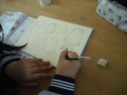 毎時間、紙コップのスケッチを描いています。本日は、鉛筆の使い方を工夫して「立体感」が出せるように紙コップの明暗を意識しながら描きます。後半は、水彩を使って「にじみ」「ぼかし」等、6つの表現を学びます。