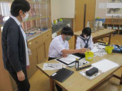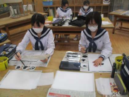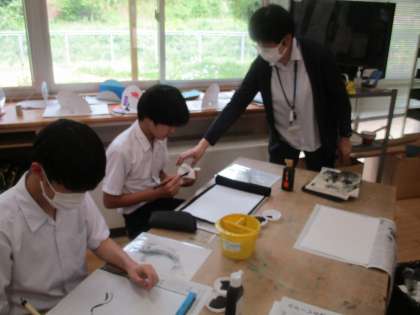 3年生の美術です。水墨画に取り組んでいます。筆の持ち方や墨の濃さ等、水墨画の様々な技法に挑戦しています。