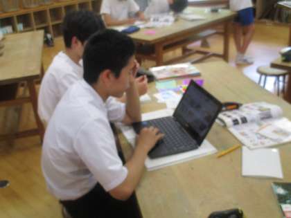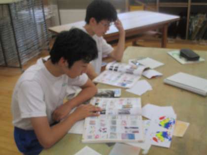 2年生の美術です。「心の風景」を様々なモダンテクニックを使って表現するために、テーマや心に浮かぶ風景を考えました。