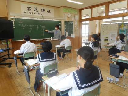 授業開始時に、前回の根号を含む乗除について、先生問題で復習しました。本日は、根号の中の数が、ある数の2乗の積になっていることを利用し、変形の仕方を学びます。習得した計算方法は、自発的に数学スキルで確認します。