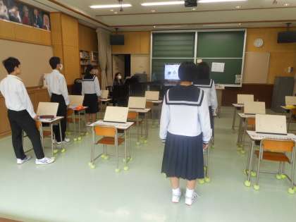 授業の始めに、歌詞の情景を思い浮かべながら校歌を歌いました。次はアルトリコーダーです。腹式呼吸を意識しながら「喜びの歌」を演奏しました。