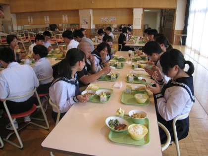 今週は、ランチルームで給食を食べます。部活動ごとに集まり、学年関係なくコミュニケーションをとりながら楽しく給食を食べました。