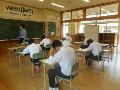 本日の授業は「連立方程式の解き方」です。前回は、加減法の解き方を学習しました。本日は、一方の式を他法の式に代入することによって文字を消去して解く「代入法」を学びます。生徒たちは「難しい」と言いながら、正解するまで何度も教科担任と確認しました。