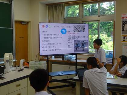 興味をもった元素について調べ、スライドにまとめて発表しました。元素によって様々な特徴があることに気付き、理解を深めました。