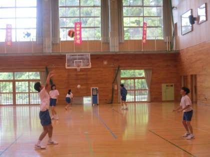 1年生の体育です。バレーボールに取り組みました。始めにペアやグループに分かれてパス練習した後、実践形式の試合を行いました。