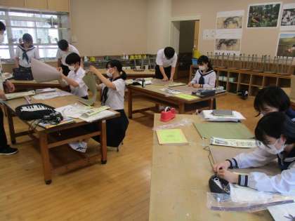 3年生の美術です。水墨画の展示準備をしています。生徒たちは、丁寧に台紙の部品を組み立てました。