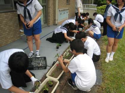 保健・美化委員会が中心となり、全校で協力して、教室前の花壇に新しい花の苗を植えました。これから毎日、委員会の生徒が分担して水やりをします。