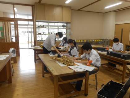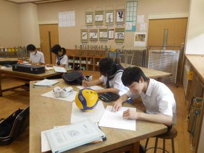 本日の学習課題は、「形をとらえよう」です。「私の大切なもの」を描きました。大まかな形をとらえ、上下左右の長さに気を配り、画面の中に収まるように構造を決めます。作品は制作途中でしたが、生徒間で描き方を聞き合っていました。