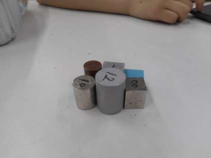 本日の学習課題は、「様々な金属を見分けるには、どうしたらよいか」です。前回の授業で計測した質量と体積から、6種類の金属の密度を求めます。その値を密度表と照らし合わせ金属の種類を推測します。生徒たちは、実験結果を見ながら密度の計算方法を班員で確認し、学習プリントを完成させます。