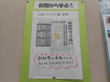 本日の学習課題は、「標高が高い高地に住む人々は、どのような生活をしているか」です。雨温図や教科書の写真でアンデス山脈と日本の気候を比べ、衣食住の特色を学習プリントにまとめます。社会科教室の後方に、新紙幣発行に伴い肖像となった3人についての新聞記事が掲示されていました。この機会に功績を調べてみるのもよいかもしれません。