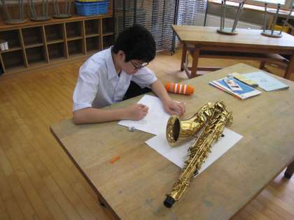 今日の課題は、「私の大切なもの 〜部分と全体のつながりを見て描こう〜」です。部活動で使っているシューズや楽器を描きました。仕上がりが楽しみです。