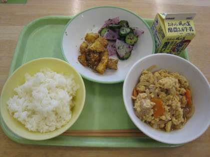 今日の給食は、ご飯、牛乳、魚とじゃがいものごま絡め、ゆかり和え、親子煮でした。給食委員が、毎日その日の献立と使われている食材についての話を紹介しています。