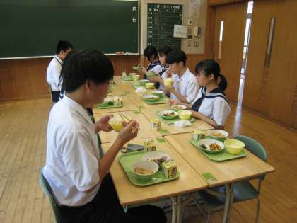 今日は、親子煮に使われている卵にちなみ、鶏が1年間に産む卵の数についてのクイズが出されました。生徒たちは何個産むのか楽しそうに考えていました。(答えは約300個だそうです。)