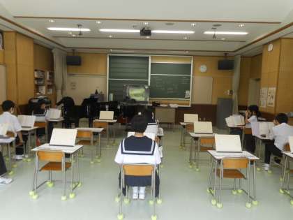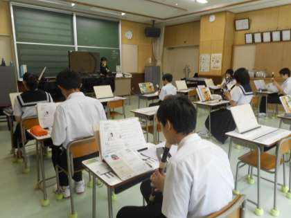 オーケストラで演奏される木管楽器、金管楽器、弦楽器について、映像と音で復習しました。毎時間「喜びの歌を」をアルトリコーダーで練習しています。今回は、息使いに気を配りながら美しい音色を奏でます。