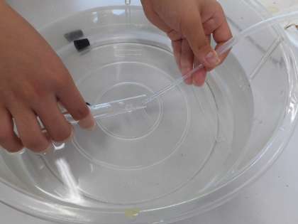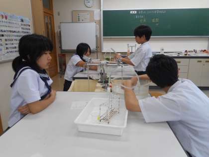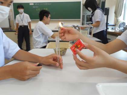 本日の学習課題は、「水素は、どのような性質があるか」です。水素の発生方法の手順に従って、実験を進めます。試験管に集めた気体に火を近付け、水素の性質の1つである「音」を確認し、学習プリントにまとめます。