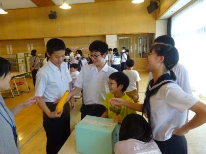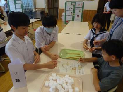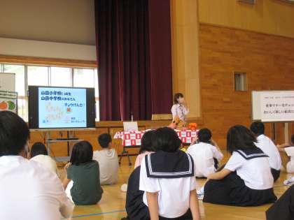 5限に、小中合同学校保健委員会を行いました。前半は、正しい箸の使い方を確認したり、握力測定で噛む力を体験したり、クイズに答えたりして、食事マナーについて関心を高めました。後半は、富山ヤクルト販売株式会社から講師を招き、食と健康に関する理解を深めました。