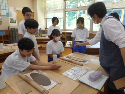 本日の学習課題は、「手順を見て、計画的に作ろう」です。前々から予告があった「焼き物」に取り組みます。水分を含んだ粘土は、焼くとひとまわり収縮することをを考えて、大きさを決めます。2時間続きの授業で一気に完成まで仕上げます。