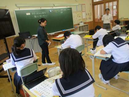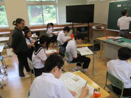 ALTから部屋にあるものの場所を聞いて、絵で表しました。生徒たちは、場所を表す前置詞や発音が似た単語をしっかりと聞き取っていました。