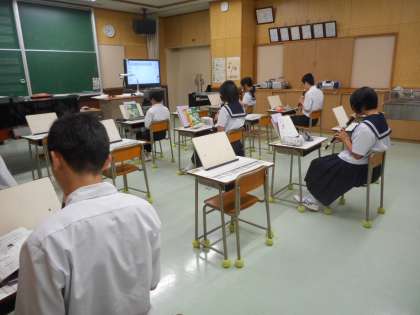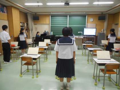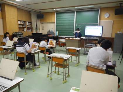 始業時に、校歌を元気よく歌いました。1学期を通してアルトリコーダーで練習した「喜びの歌」を、なめらかな音色を奏でることを心がけて演奏しました。最後に、「静かにねむれ」をCDで鑑賞し、教科書で曲の音階と旋律の雰囲気を確認しました。