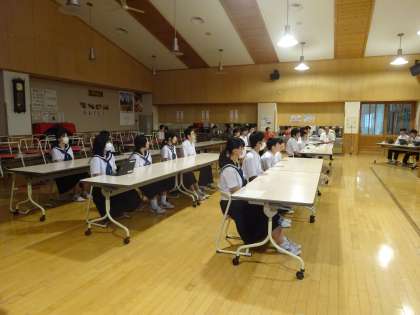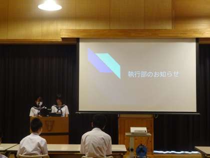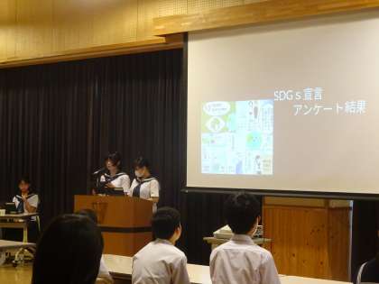 1学期最終日は、生徒集会で幕を開けました。最初に、執行部からSDGsに関するアンケートの結果を報告しました。また、使用していない充電器をコンセントから抜くなど、節電やCO² 排出量を減らすための取組を全校に紹介しました。