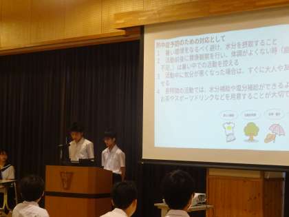 保健美化委員会は、熱中症になりやすい条件と予防のための対応を紹介しました。