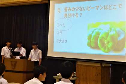 給食委員会は、旬の食材(ピーマン、なす、トマト)に関するクイズとおすすめの食べ方を紹介しました。