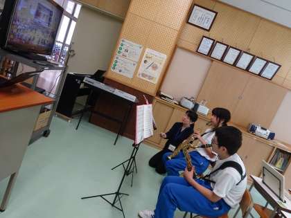 吹奏楽部の様子です。明日の本番に向けて、演奏のVTRにあわせて練習に励んでいます。
