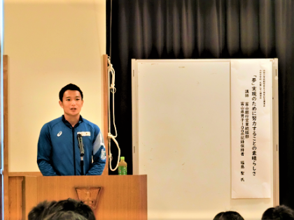地元の富山銀行に勤務しながら100m走でオリンピック出場を目指している福島さんを講師にお招きし、先輩に学ぶ講演会を行いました。生徒たちは、夢に向かって努力する大切さを教えていただきました。
