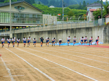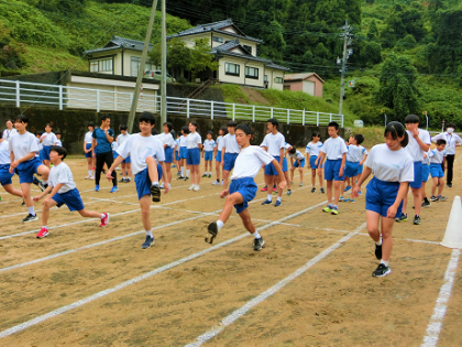 講演会後の陸上教室では、グラウンドに出てトレーニングの練習や走り方を教えていただきました。今週末の運動会に向けて、速く走るコツを教えていただきました。最後に、有志の生徒が福島さんと一緒にレースを行い、オリンピックを目指している人の凄さを、間近で体感しました。
