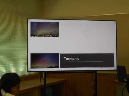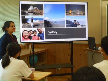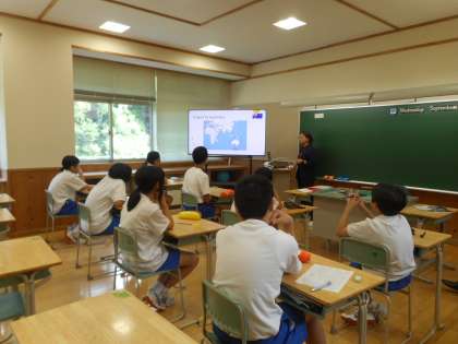 2学期初のALTを迎えての授業です。「My Summer Vacation」と題して、ALTから夏休みに訪れた国々について、スクリーンを見ながら体験談を聴きました。