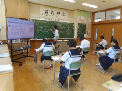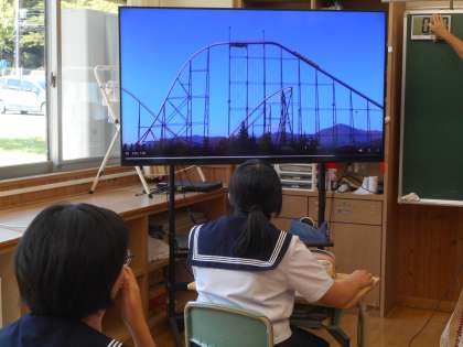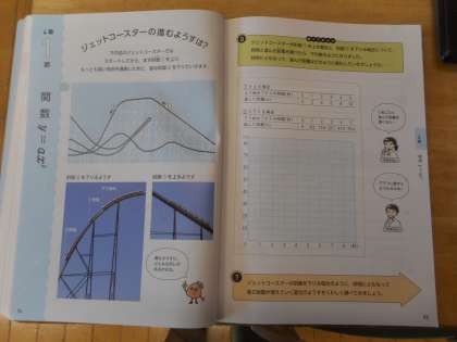 本日の授業は、2次関数です。ジェットコースターが上る場合と下る場合について、進んだ距離と時間を教科書の表やグラフを完成させます。そこから読み取れる x と y の関係を考えます。