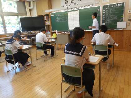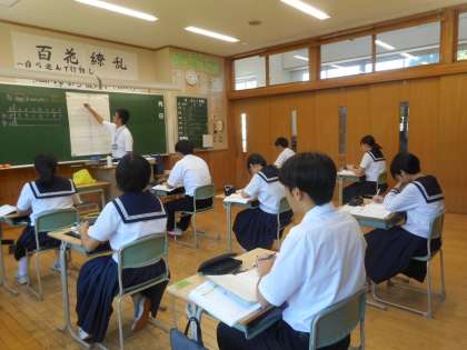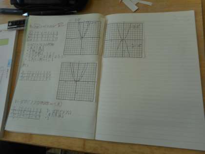 本日の授業は、「2次関数のグラフ」です。比例定数が正と負の場合、座標点の並び方がどのような違いがあるかを捉えます。生徒は、正確にグラフを書くことに集中しました。
