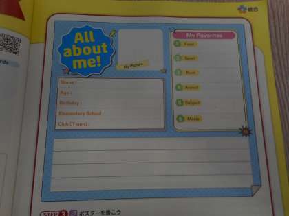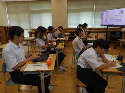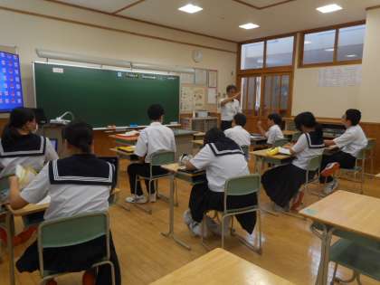 始業時、中間評価の範囲について確認しました。授業では、“All about Me” Poster と題して、掲示版に自己紹介ポスターを貼ると仮定して、英文を考えます。取り上げたい話題を1つに絞り、マッピングを仕上げた生徒は、教科担任と内容を確認し、英作文を書き始めます。