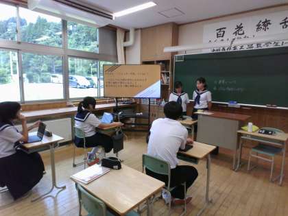 後半は、夏休みに実践したSDGsの課題発表を行いました。「ジェンダー平等を実現しよう」をテーマに選んだ生徒は、富山市内の高校の制服にスラックスが導入されているかを調査し、富山市内の高校で少しずつジェンダーレス制服が広まっていることを発表しました。一方で、男子のジェンダーレスについては広まっておらず、今後は男女関係なく制服を選べるようにするべきだと考えました。