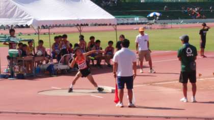 1年生は、砲丸投げに出場しました。男子生徒は、並み居る2年生をかき分け決勝に進出し、最終6投目で自己ベストを更新し、6m79cmで見事3位入賞を果たしました。併せて、来月に行われる県大会への出場権も獲得しました。