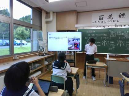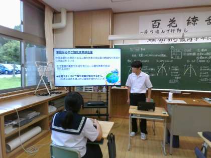 「地球温暖化」をテーマにした生徒は、家庭から排出される二酸化炭素の量が排出量全体の15%を占めることが分かり、夏休みに節電・節水について取り組んだことを紹介しました。