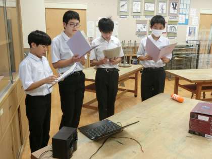 学習発表会に向け、男声パート・女声パートに分かれて合唱練習をしています。楽譜を見て歌詞を覚え、音取りをしている段階です。