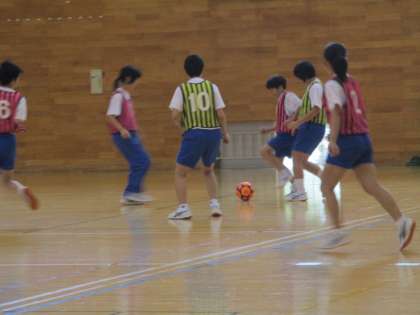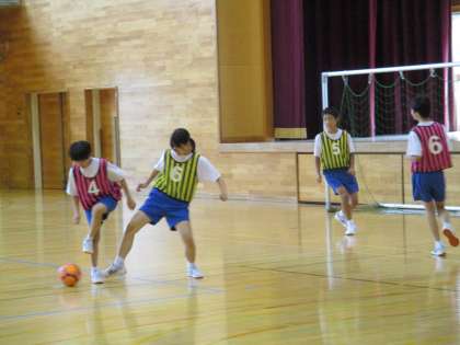 フットサルのゲーム前に、チームで目当てを決め、全員で積極的なゲームに取り組みました。