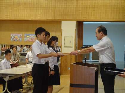 新生徒会役員の認証式と、新委員長の委嘱式を行いました。新生徒会長からは「異学年交流が気軽に行えるような明るい学校にしていきたい」と挨拶がありました。新委員長も、それぞれの委員会で力を入れたい取組を発表しました。