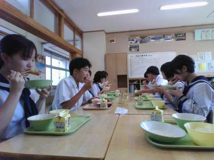 3年生給食の様子です。春巻きの音が教室内に響いています。