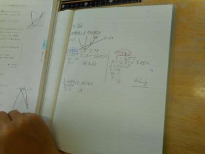 本日の授業は、放物線と直線を使って様々な問題を考えてみます。放物線と関数y=x+4のグラフ上の2つ交点から、2次関数の変化の割合を求めます。さらに発展して、高校入試にもよく出題されるグラフ上の面積を求める問題にも挑戦しました。