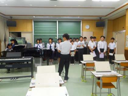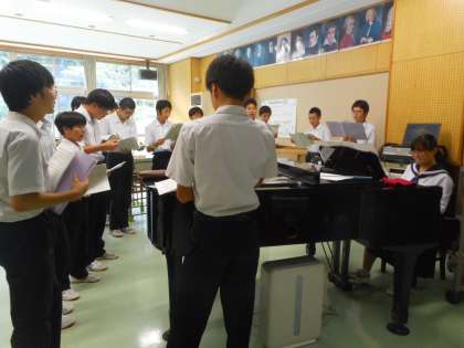 全学年で、第1回目の合唱曲の練習をしました。始業時、指揮者と伴奏者の紹介がありました。10月から11月にかけて、3会場で合唱曲を披露します。1回1回の練習を大切にし、観衆の心に届くハーモニーを作りあげることを期待しています。